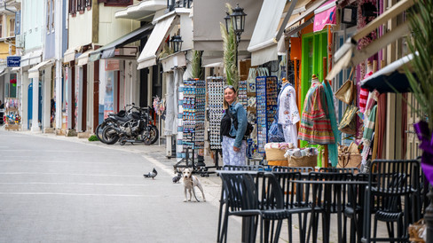 Die touristische Einkaufsstraße war schon lebendiger, aber charmant – kleine Läden, farbenfrohe Häuser und der Duft nach frischem Gebäck und Kaffee in der Luft. Lefkada wirkt entspannt, einladend, fast ein bisschen wie ein Dorf – trotz des Trubels.